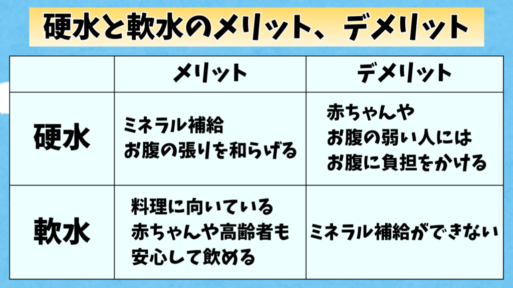 ・硬水はミネラルが豊富なのがメリットでクセがあって人によっては飲みにくいのがデメリット