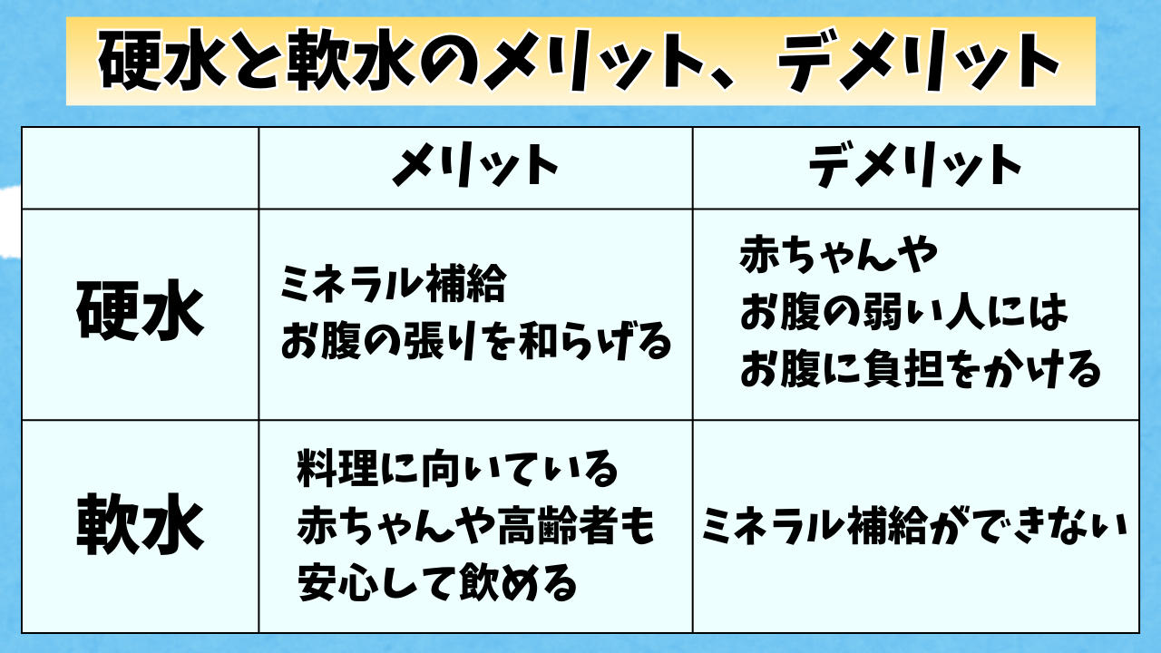 今日は硬水と軟水について違いやメリット・デメリットについて話をしてきたよ。